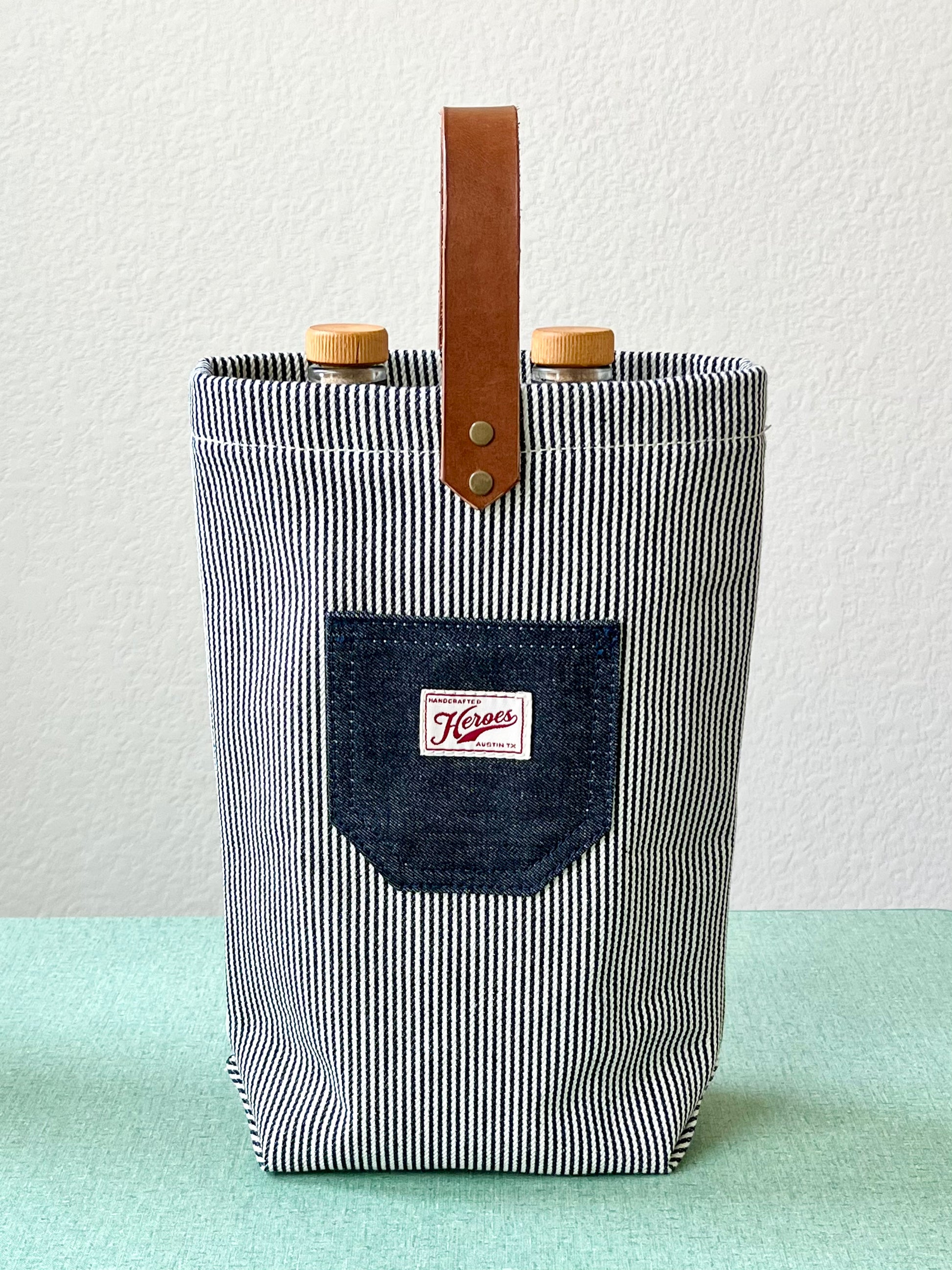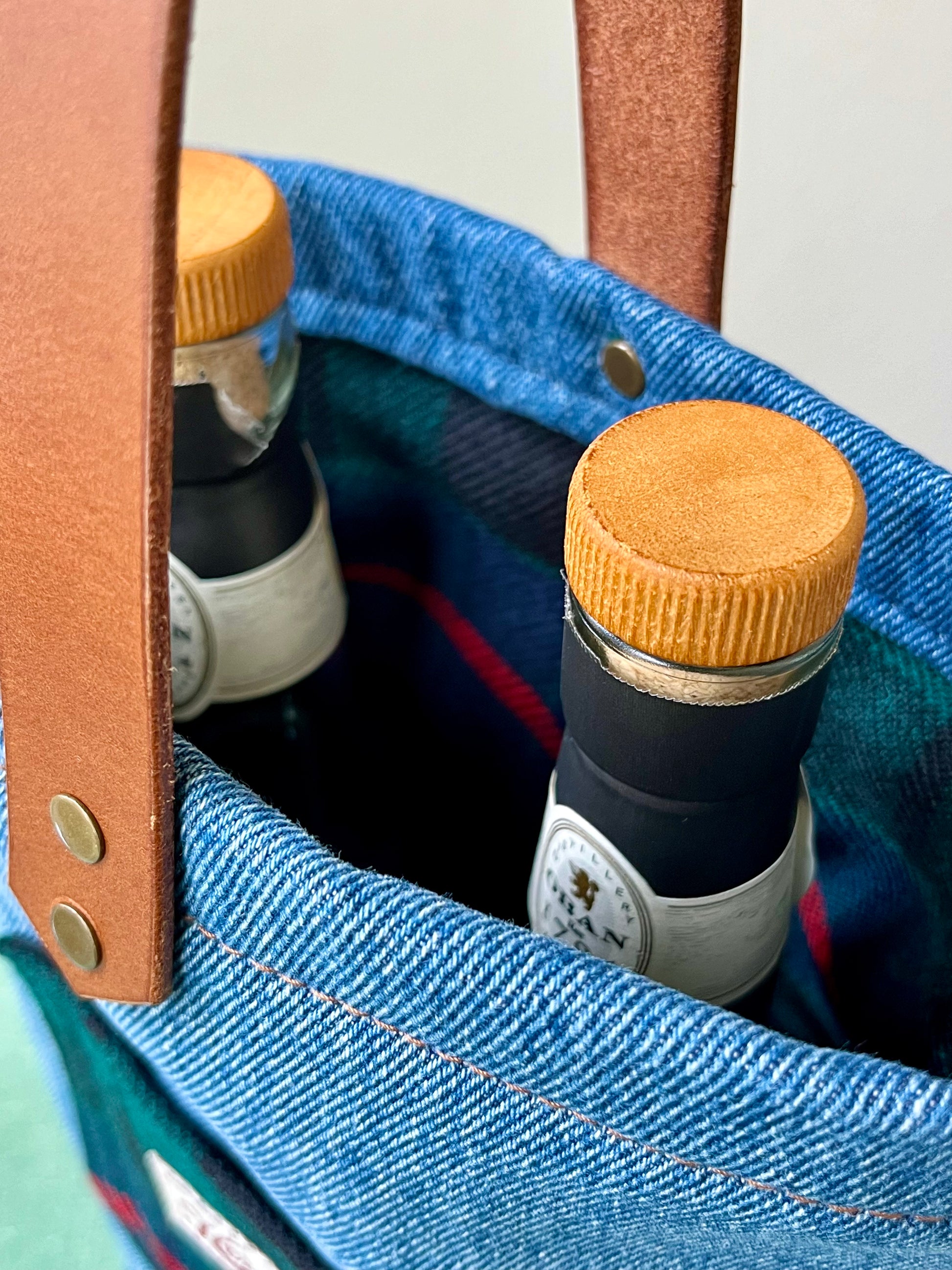 The Bottle Bag is made from a variety of fabrics including Japanese denim and Scottish waxed canvas and lined with canvas. It’s finished with veg-tanned Italian leather handle and heavy duty copper rivets.