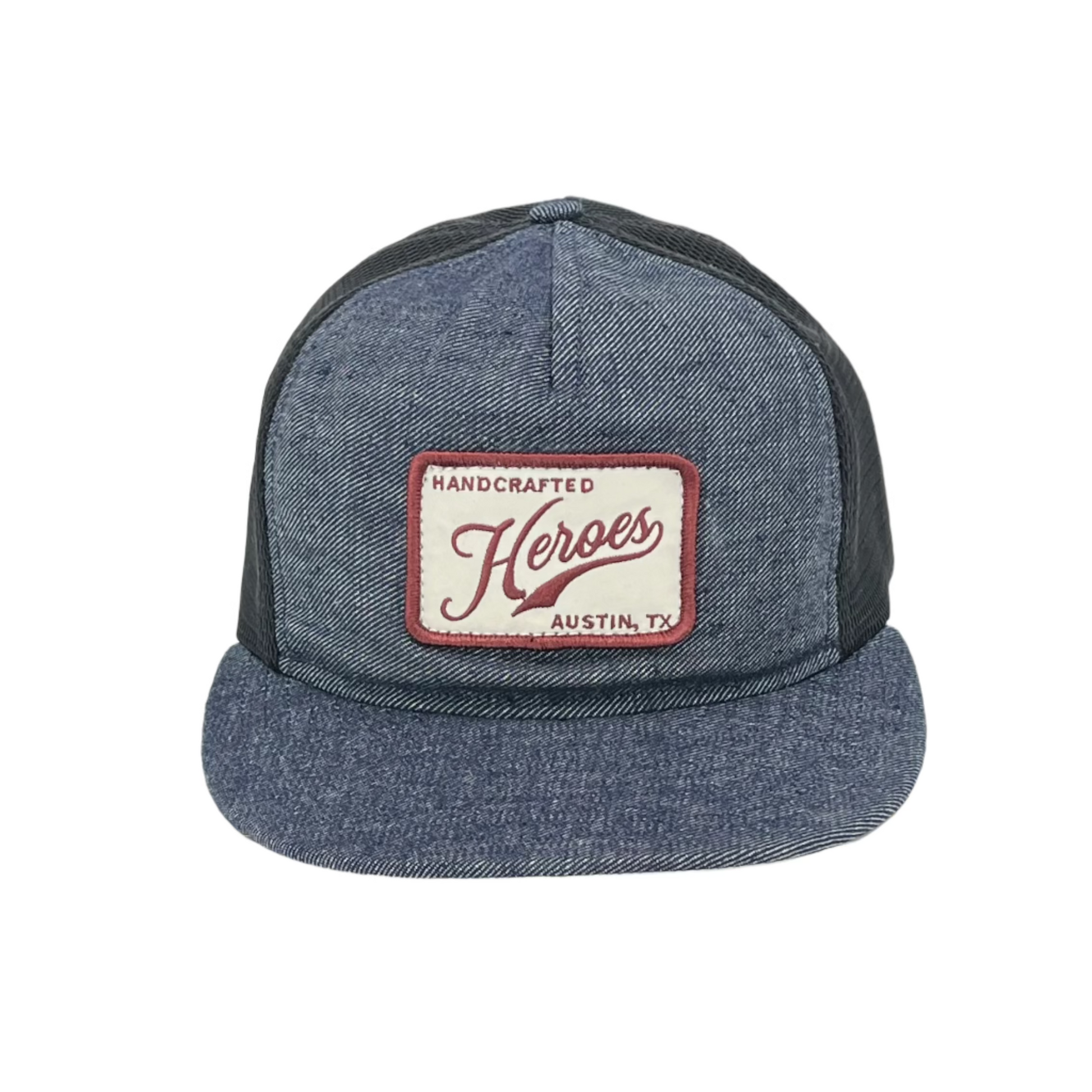 The Denim Trucker Hat is made in the USA by Sandlot Goods hat company. We have added our Heroes vintage inspired embroidered twill logo patch. This hat features a flat, baseball-style bill, 100% cotton right hand twill denim in the front, light grey twill for the under-bill, poly mesh back, and plastic snapback closure.