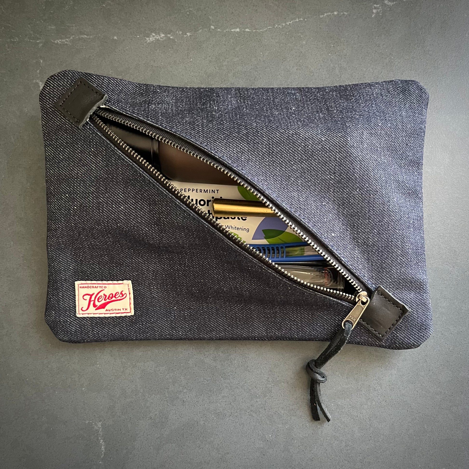 The Flat-Pack Travel Kit is available in a variety of denim options and lined with a heavyweight canvas. Heavy-duty metal zipper with leather pull for easy closure.