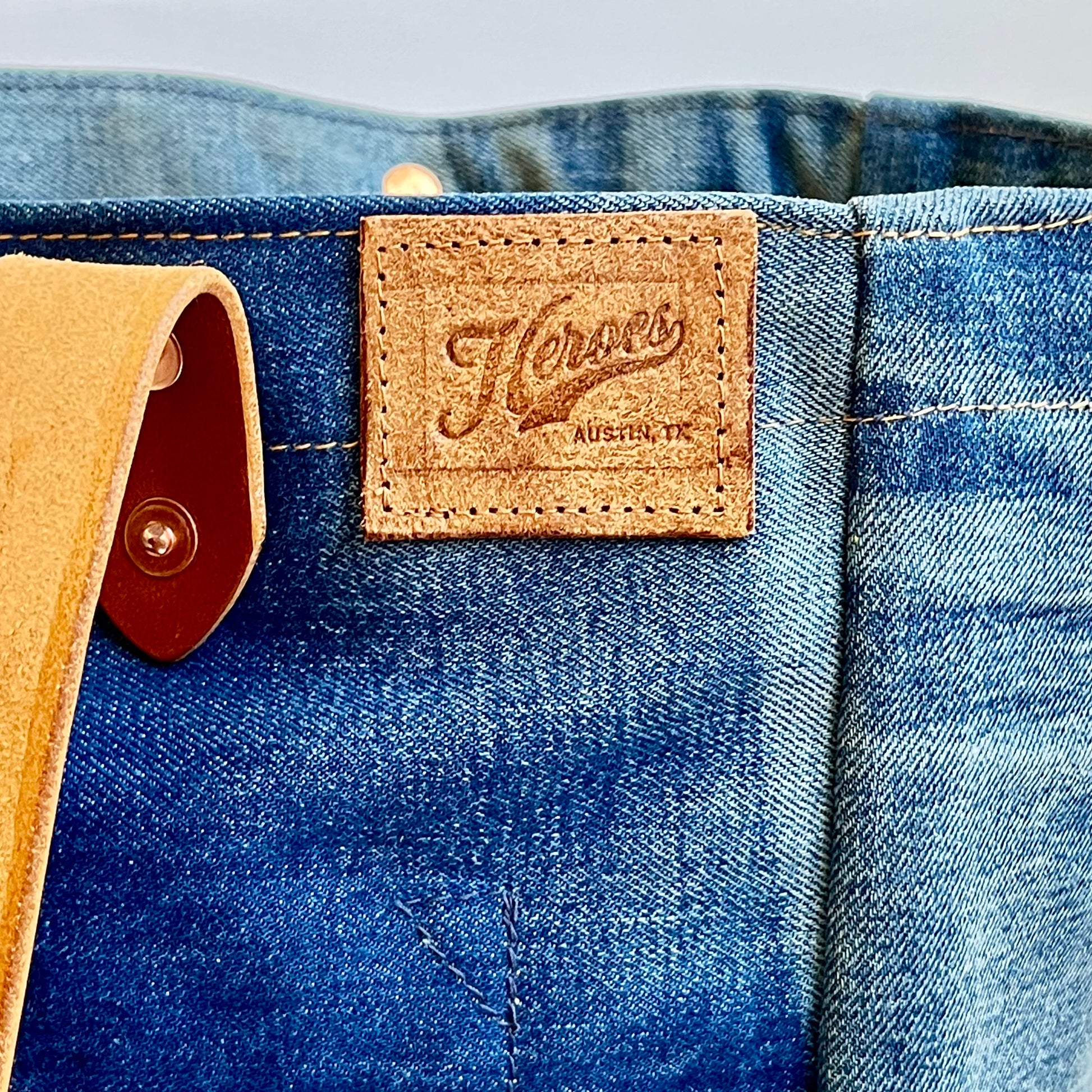 The Hand-Me-Down Tote is MADE TO ORDER. It is made from recycled denim scraps from a single 5-pocket jean and lined with a heavyweight canvas. It is finished with leather handles made from a beautiful Italian bridle leather. Each vintage 5-pocket is hand-picked. Denim fabric, shades, abrasion patterns, and canvas colors will vary based on available recycled scraps.